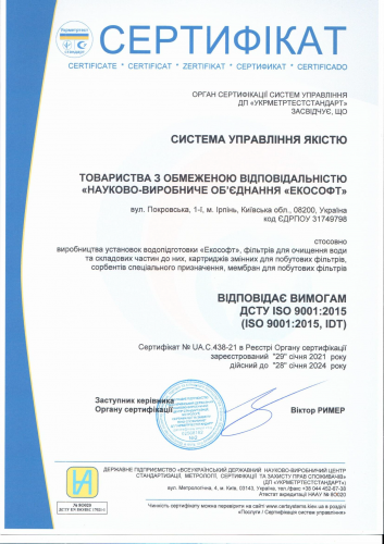 Sistemi i menaxhimit të cilësisë për prodhimin e impianteve të trajtimit të ujit Ecosoft, filtrave shtëpiake për pastrimin e ujit dhe fishekëve të zëvendësueshëm, prodhimit të sorbentëve për qëllime të veçanta, i kryer nga Ecosoft LLC, plotëson kërkesat e DSTU ISO 9001:2015