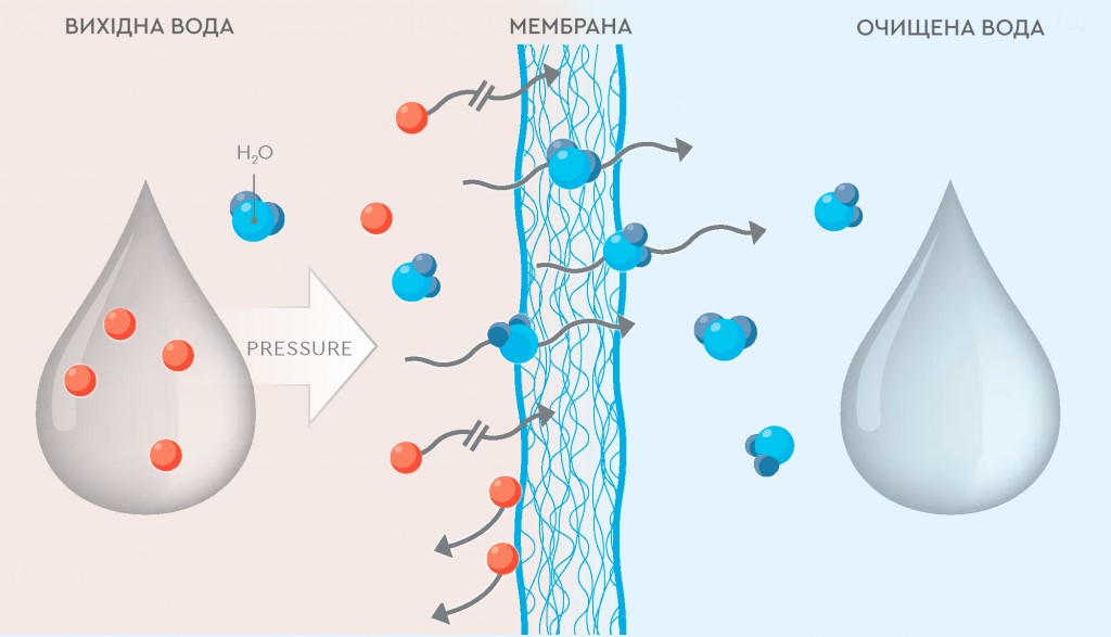 Brenda modulit të membranës, uji ndahet në dy rrjedha – koncentrat dhe përshkues. Koncentrati derdhet në kanalizim, dhe depërtimi përdoret për deodorizimin dhe mineralizimin (nëse sigurohet).