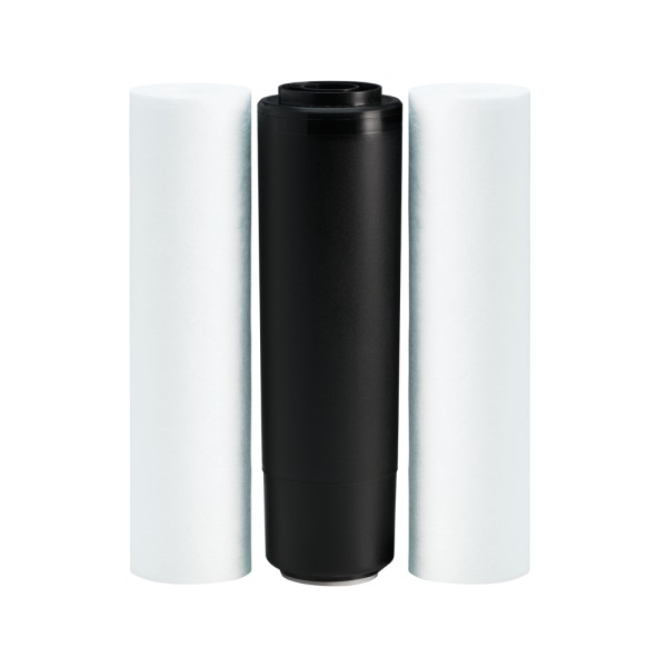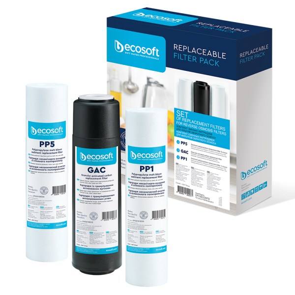 Kompleti përfshin tre filtra Ecosoft, të cilat janë të nevojshme për parapastrimin e ujit përpara elementit të membranës në filtrin e osmozës së kundërt.